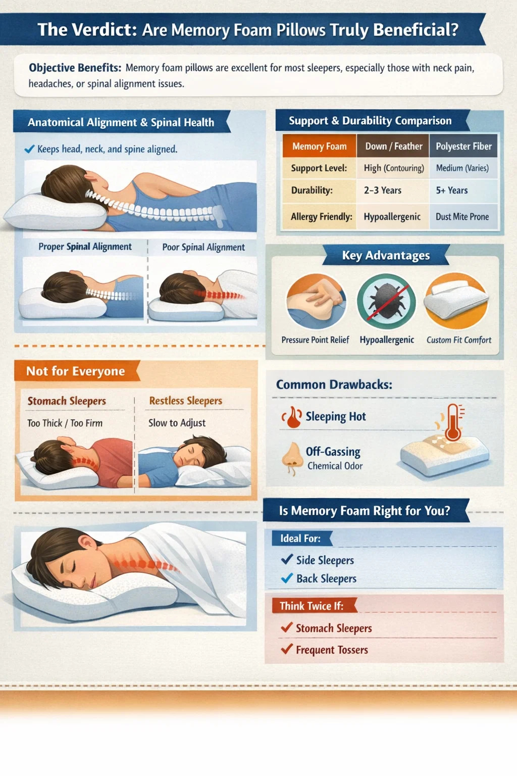 Obwohl sie erhebliche orthopädische Vorteile bieten, sind sie kein Allheilmittel. Ihre „Güte“ hängt maßgeblich von Ihrer persönlichen Schlafhaltung, Hitzetoleranz und Empfindlichkeit gegenüber Materialgerüchen ab. Für einen Seiten- oder Rückenschläfer kann ein Memory-Schaum-Kissen eine gute Wahl sein transformatives Werkzeug für die Schlafhygiene , wohingegen ein Bauchschläfer sie möglicherweise als zu eng oder zu fest empfindet.